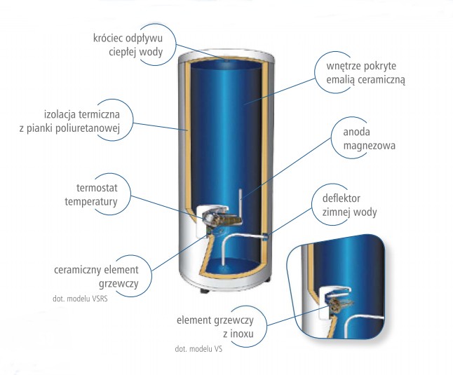 - trwałość – zastosowanie ceramicznych powłok zbiornika i grzałki zmniejszające zużycie
